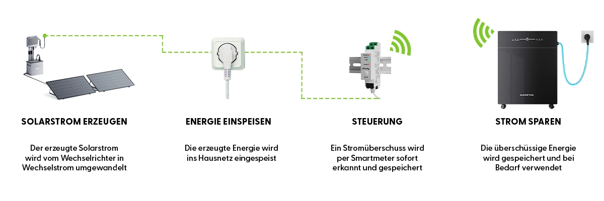 Je nach AC-Speicher wird dieser entweder parallel zum PV-Wechselrichter auf der Wechselstromseite des Hausnetzes installiert oder ganz einfach per Plug & Play an eine haushaltsübliche Steckdose angeschlossen. Der Speicher wird mit dem überschüssigen Wechselstrom aus der PV-Anlage oder dem Balkonkraftwerk geladen und wandelt beim Entladen den Gleichstrom wieder in Wechselstrom um.